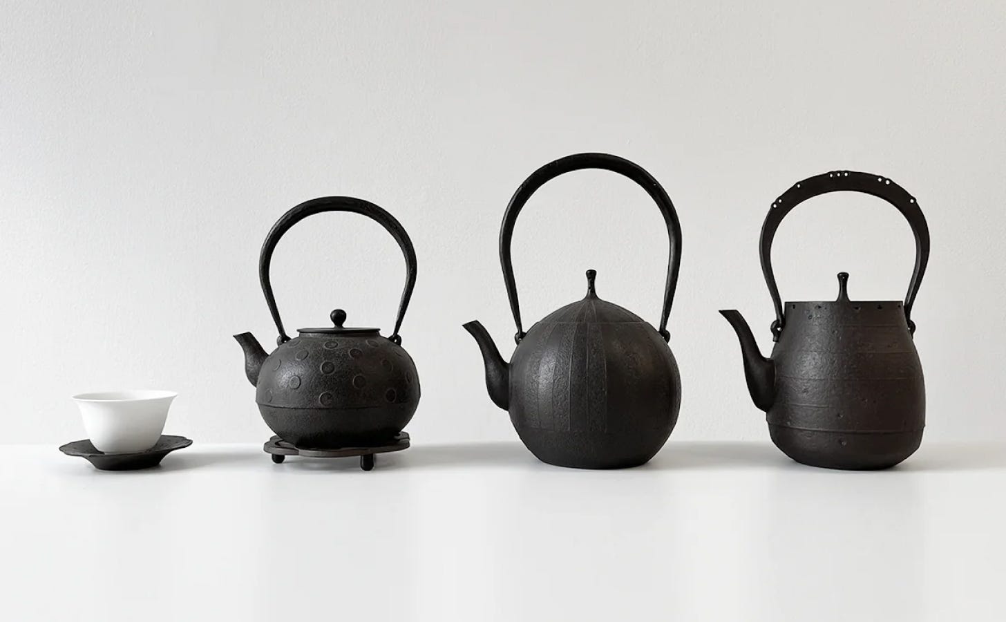 The Nanbu tetsubin is a cast-iron kettle that has been made in Morioka, in Japan's Iwate Prefecture, by the same foundry families since the mid-Edo period — roughly 400 years of continuous production. The process hasn't changed much: molten iron is poured into sand moulds, each one unique, each kettle finished by hand and fired until a natural oxide layer forms inside the walls. That layer is the point. When you boil water in a Nanbu kettle, trace iron leaches gently into the water, altering its mineral quality in a way that tea drinkers have considered essential for centuries. Iwachu is the most storied name in the tradition; Suzuki Morihisa Studio the most revered, with a lineage that now spans sixteen generations. A piece from either atelier will outlast everything else in your kitchen by several generations. That is not a selling point. It is the premise.